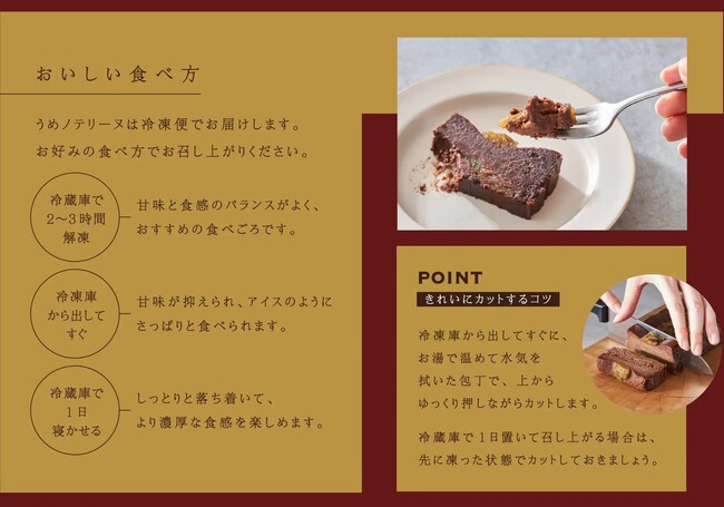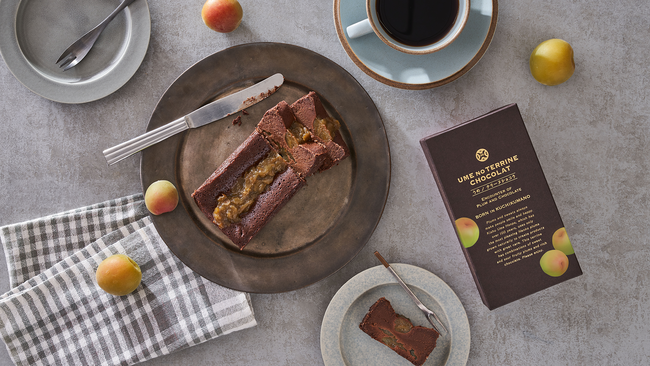 「うめノテリーヌショコラ」は「梅の美味しさをもっと多くの人に届けたい!」という想いから、スイーツ作りが始まりました。数十を超える試作品の中で、職人がひとつひとつ丁寧に漬け込んだ芳醇な紀州南高梅をチョコレートテリーヌにふんだんに使用し「爽やかな香りとほろ苦い甘味」を愉しむことができる「うめノ テリーヌショコラ」が完成しました。しっとりとしたチョコレートテリーヌに、肉厚な梅の食感、香りと苦味のマリアージュ、最後にほのかにコーヒーの香りをまとわせることで、大人のスイーツに仕上げました。バレンタインにぴったりなこの商品を、ぜひお楽しみください。