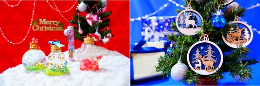 星型ボトルに蓄光パウダーを入れたオーナメントや、カラフルポンポンを使ってリースづくりを楽しめます。おうちのクリスマスツリーに飾りましょう。