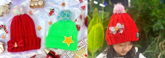 カラフルなニット帽とポンポンを選んであったかアイテムを手づくりします。ポンポンの形を丸く整えて星のワッペン等を貼ればクリスマス仕様のオリジナルポンポンキャップの出来上がり。