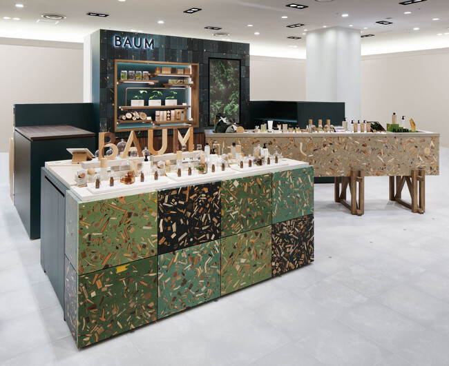 自然と共生する暮らしをテーマとするフロアへの出店であったことから、BAUMの循環思想のストーリーを表現し、感性で樹木に触れ、体感できる場所にしたいという想いのもと、デザイナー、狩野 佑真氏のマテリアルデザイン、「ForestBank(TM)️ (フォレストバンク)」とコラボレーション。