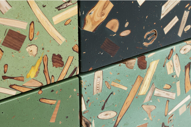 森林をめぐる課題や可能性についてリサーチを行い、製材された木材だけでなく森林そのものが持つ多様な価値に着目し、それを表現するべく様々な実験を通して新たなマテリアルとして開発されました。建築や家具に使用されることの少ない小径木や枝葉、樹皮、実、その森の土など樹木にまつわる様々な物を、反応性ミネラルベースと有機溶剤・VOCを一切使用しない完全水性アクリル樹脂と混ぜ合わせ製作されています。
