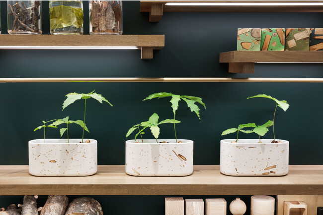 ハイドロ エッセンスローションや、オーデコロンの木製パーツが作られる過程をご覧いただける他、ストアで育てている苗木が成長していく様子、ForestBank(TM)️の端材ディスプレイなど、BAUMの循環思想を包括的に実感いただけます。