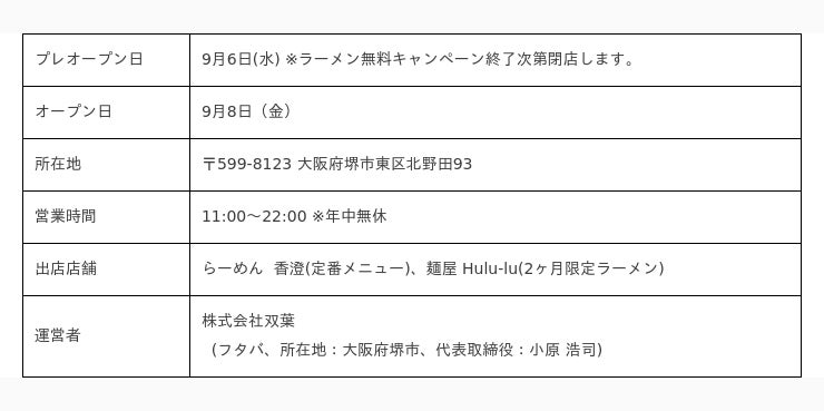 オープンに際し、9月6日(水)のプレオープン時に、先着100名様に対し、大阪の名店「らーめん香澄」の魚介旨塩ラーメンを無料でプレゼントすることをお知らせいたします。
