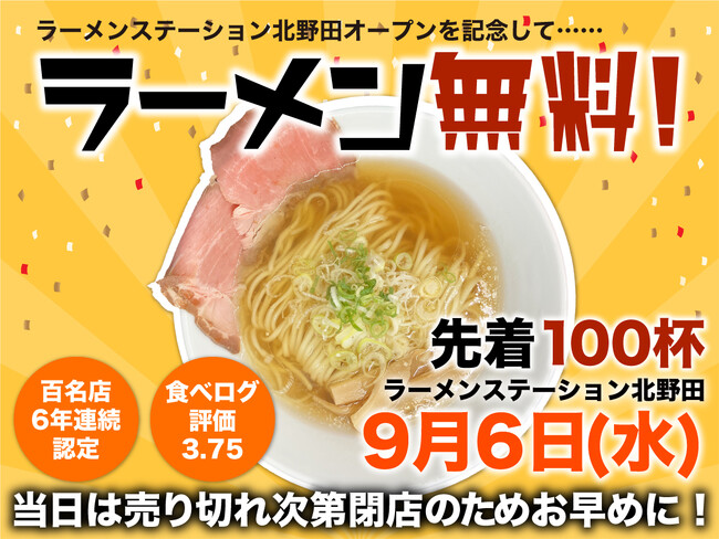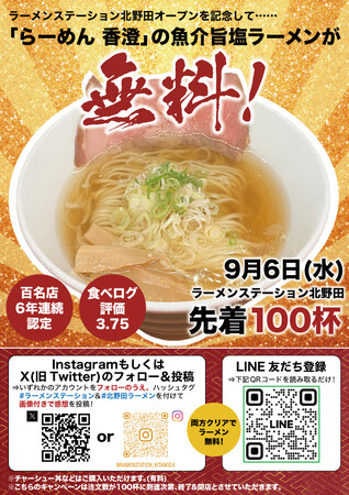 「ラーメンステーション北野田」では、記念すべきオープンに先立ち、プレオープン日である9月6日(水)午前11時より100杯限定で、「らーめん香澄」の「魚介旨塩ラーメン」を無料で提供させていただきます。(※先着順)(※SNS投稿等の条件あり)