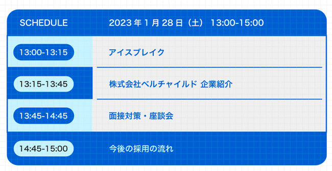 大阪に本社を構えるIT企業 株式会社ベルチャイルドの24卒採用に向けた就活イベントは、就活生が想像する、リクルートスーツを着込んで髪をセットし、面接練習を重ねた上で行われる一般的な就活とは全く違う座談会形式で行われました。