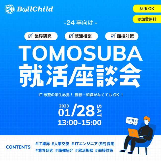 学生無料コミュニティスペースTOMOSUBAを手がけるTOMOIKI VENTURES株式会社は、1/28(土)にソフトウェアの開発・導入・保守・運用などを行う、株式会社ベルチャイルドの24卒以降の採用に向けた少人数対面型の就活座談会を行いました。