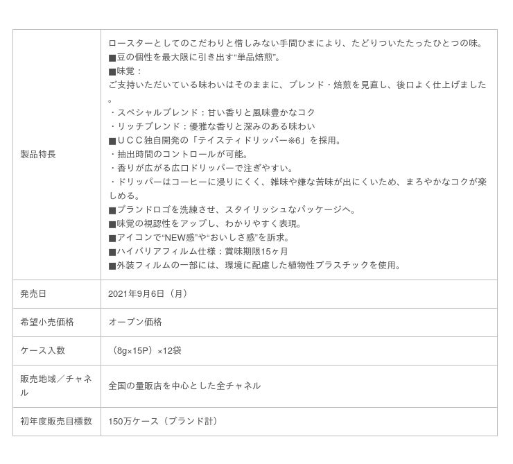 UCC上島珈琲株式会社(本社/神戸市、資本金/10 億円、社長/朝田文彦)は、家庭用レギュラーコーヒーの主力ブランド『UCC ゴールドスペシャル』の粉・炒り豆製品の容量を変更するとともに、全製品の味覚とパッケージをブラッシュアップして、9月6日(月)から全国でリニューアル発売します。