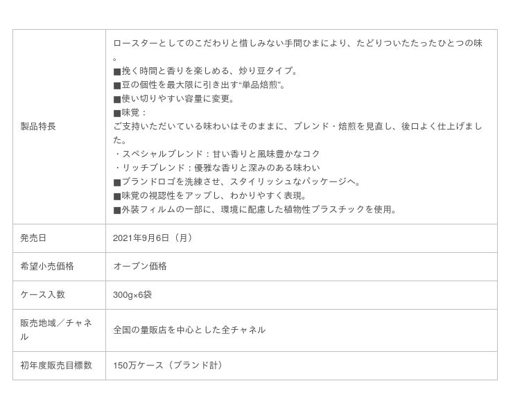 この度、粉・炒り豆製品については、世帯人数や個々人の生活スタイルの変化により、家庭用レギュラーコーヒーの購買ボリュームゾーンが大容量から中容量へとシフトしていることから、使いきりやすい容量へ変更します。