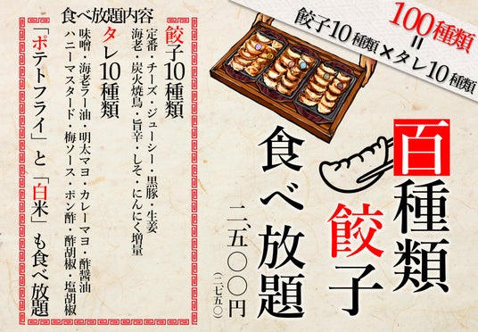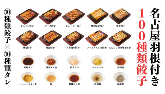 愛知県内に7店舗展開している「名古屋羽根付き餃子にこにこ餃子」では看板商品として「100種類の餃子」を提供しています。10種類の餃子と10種類のタレを組み合わせて100通りの味を楽しめます。名古屋コーチンを8時間以上炊き上げて抽出した鳥ガラスープを使用しており、餃子に深みとコクを与え一層の味わいを楽しむことができます。