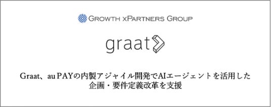 グロースエクスパートナーズ株式会社(本社:東京都新宿区、代表取締役社長:渡邉 伸一)の子会社であるグロース・アーキテクチャ&チームス株式会社(本社:東京都新宿区、代表取締役社長:鈴木 雄介、以下 Graat)は、KDDI株式会社(本社:東京都港区、代表取締役社長:松田 浩路、以下 KDDI)との協働により、KDDIが提供するQRコード決済サービス「au PAY」の内製アジャイル開発において、AIエージェントを活用した企画・要件定義改革を支援しております。