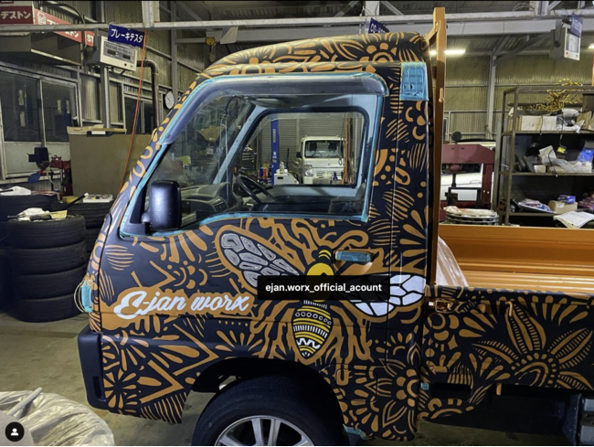企業案件でトラックやシャッター、壁画のデインも場所を選ばずどこでも描けるのが彼女のアートの特徴!