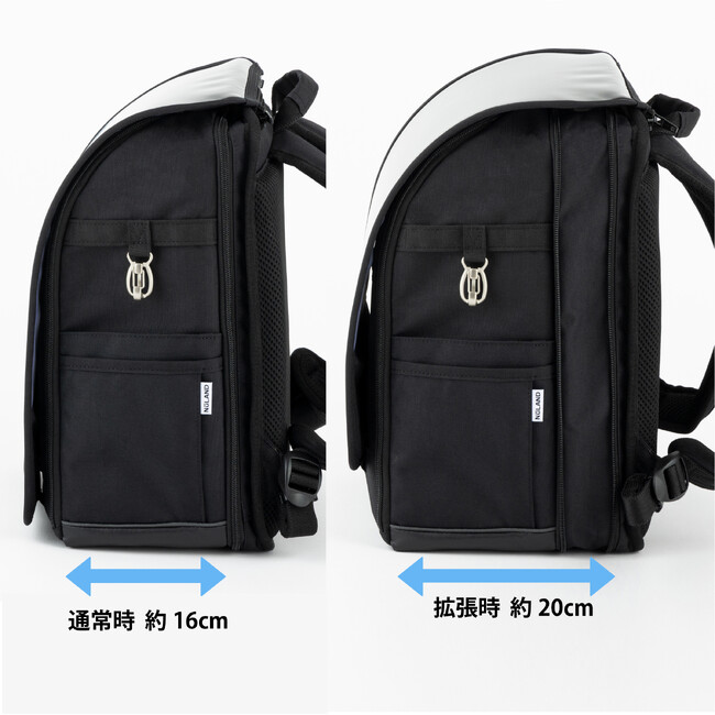 追及したのは大容量なのに軽く、そして背負いやすいこと。重さはわずか約930グラム*。フラップを外すと700グラムにも。月曜と金曜に顕著な荷物の大増量に対応すべく、マチ幅が変動でき、日によって容量を変えられれたり、新しい小学生の荷物のタブレット類や水筒の収納にも対応した機能的な設計です。