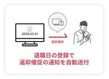 「SmartHR」で退職手続きを行なった従業員の退職日が「Birdeye」に自動で連携されます。退職日が確定した時点で、従業員に対して返却手続きを促す通知が送信され、退職時の資産回収をスムーズに行うことができます。その結果、大切な資産の紛失リスクを低減し、管理業務の負担を軽減します。