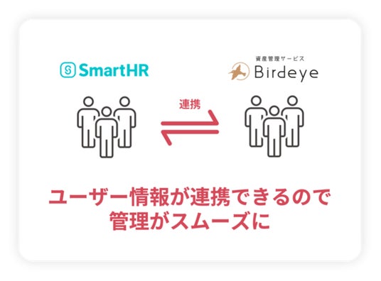 今回の連携により、クラウド型資産管理サービス「Birdeye」とクラウド人事労務ソフト「SmartHR」との間で、以下の2つの機能が実現されます。