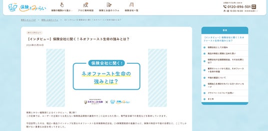 インターグ株式会社(本社:東京都港区、代表取締役社長:那須 剛、以下、インターグ)が運営する総合保険サイト「保険とみらい」(https://hoken-to-mirai.com/)は、このたび、ネオファースト生命保険株式会社の後藤様のインタビューコンテンツを公開いたしました。