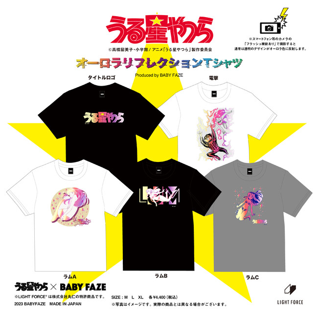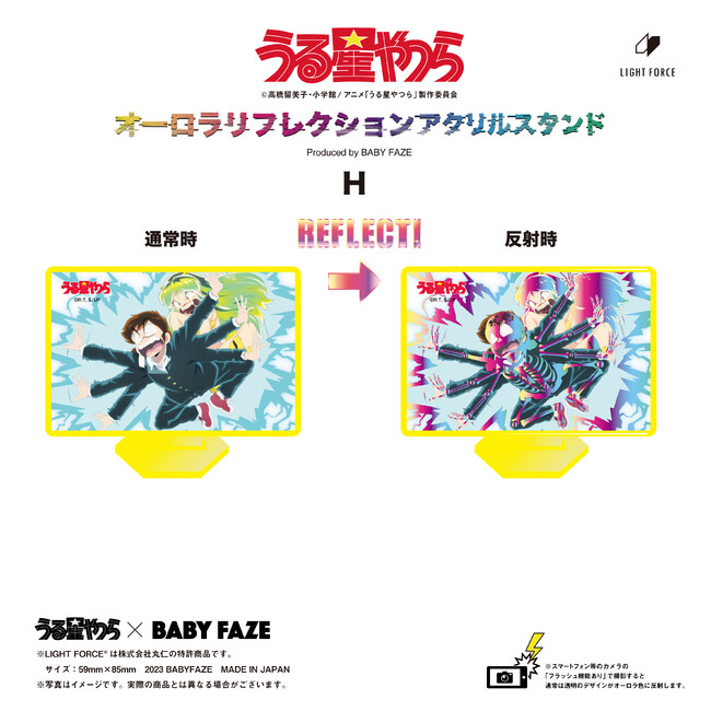 宇宙初!!人気TVアニメ「うる星やつら」のオーロラリフレクションアクリルスタンドが誕生。スマートフォン等の「フラッシュ機能オン」で撮影するとアクリルスタンドのデザインがオーロラ色に反射して映ります(※角度やライティングによって光り方が変わります)。缶バッジ、Tシャツ、マスクも同時発売!!
