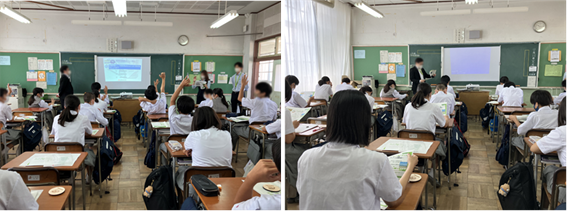 園田中学校では、今年度から各学年でSDGsの学習を行っており、今回の出前授業は、この学習支援の一環として行われました。当日は、2年生の41名を対象に、動画やパワーポイントを用いて当社が取り組んでいるSDGsの取り組みをお伝えいたしました。具体的には、昨年実施した水素自動車MIRAIを使用した「MIRAIリレー」の説明を参加型のクイズ形式で実施、さらに間伐材を利用して制作したオリジナルコースターを教室に持参して、実際に手に取ってもらいながら間伐材の有効活用について説明を行いました。9月には、当社への訪問も予定されており、今回の授業では伝えることが出来なかった取り組み内容などについても、実際の商品を見ながら説明をおこないたいと思っております。
