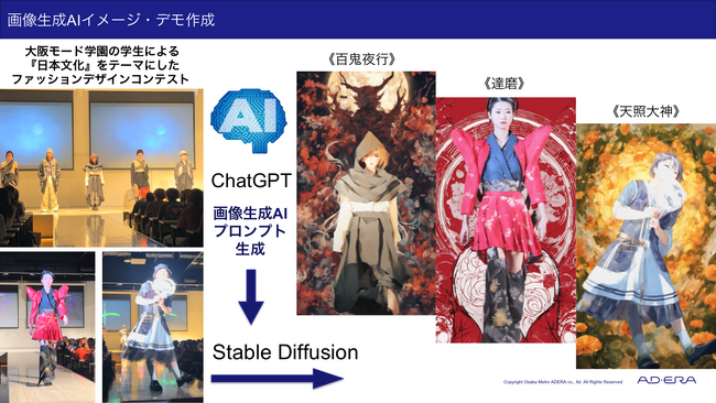 大阪モード学園は、9月8日にファッションデザイン学科 高度専門士コース、ファッションデザイン学科、ファッションテクノロジー学科の学生による『日本文化』をテーマにしたファッションデザインコンテストを開催。このコンテストでは優れたクリエイティブな作品が評価され、大阪メトロアドエラはOsaka Metro ADERA賞を贈呈しました。その作品から縦型のデジタルサイネージ用映像コンテンツを、産学連携でジェネレーティブAIを活用して生成します。