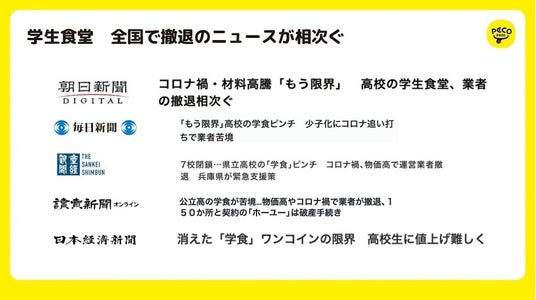 日本の学校の昼食を取り巻く環境は、少子化やコロナ禍、物価高による食材の高騰、人材不足などを受け、食堂を運営する給食会社の収益性が低下し、全国で業者の撤退が相次ぐなど、多くの学校で学食の維持が難しくなっています。