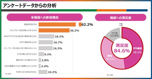 ・本施策の参加者を対象に実施したアンケートでは、参加理由として「鉄道が好きだから」が62.2%と最多であり、次いで「スタンプラリー形式が楽しそうだったから」(36.2%)が続きました。これらの結果から、鉄道IPとスタンプラリー形式を組み合わせた設計が参加モチベーションを高めていたことが示唆されます。