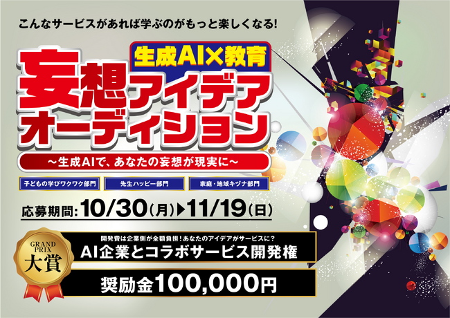 教育現場AI活用推進機構(AIUEO)は、10月30日(月)~11月19日(日)を応募期間として、『生成AIがあなたの妄想を現実に!「生成AI×教育」 妄想アイデアオーディション!』を開催します。「教育×生成AI」をテーマにしたアイデアを募ることで、教育関係者をはじめ、子どもを取り巻く多くの人、そして子ども自身が教育分野での生成AI活用の可能性とAIリテラシーの大切さに気付けるきっかけを提供することを目的としています。