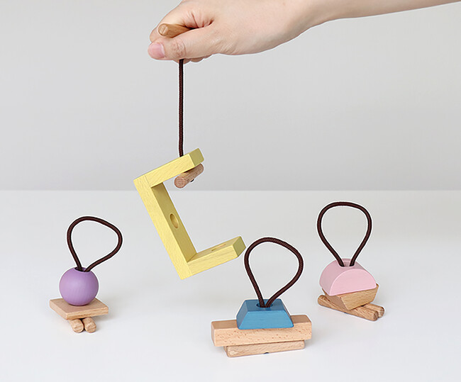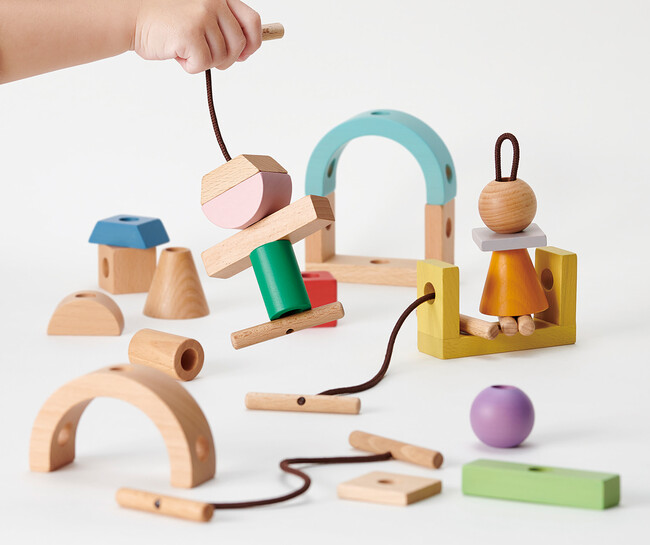 ひもの両端についている棒は、どちらの端からもピースを通すことができ、通したピースがひもから抜け落ちることを防ぐストッパーにもなります。あそんでいる最中にピースがひもから抜け落ちることがないので、自由に持ち歩いたり動かしたりする新しいあそびが楽しめます。