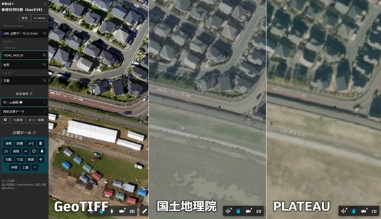 GeoTIFF、地理院オルソ、PLATEAUオルソの「最高画質」を比較した様子。GeoTIFFでは地理院タイルよりも高解像度なタイルを生成しています。