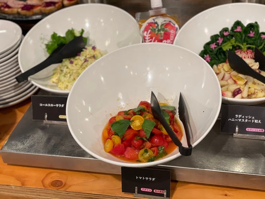 冷製料理はトマトサラダ(鈴木農園、アグリコ)、コールスローサラダ(ホクシン)、ラディッシュのハニーマスタード和え(らでぃっしゅ屋)など。