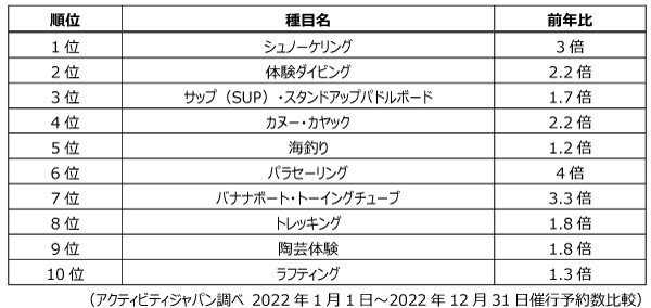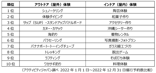 株式会社アクティビティジャパン(本社:東京都新宿区)、以下アクティビティジャパンは、2022年12月20日(火)までの予約データを元に、2022年度の人気アクティビティ『総まとめ』をランキング形式で発表します。