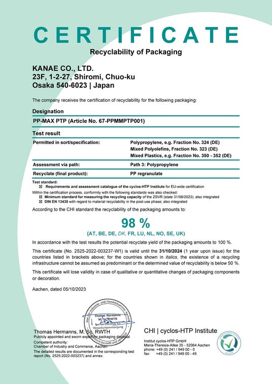 単一素材のPTP包装で、ドイツに拠点を置く独立研究所「Institute cyclos-HTP」よりポリプロピレンとしてリサイクル適性を評価され、認証を取得しています。