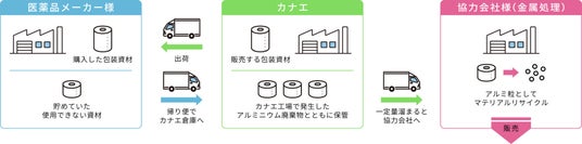 カナエでは、自社で生じるアルミニウム廃棄物や、改版などで使用できなくなったアルミフィルムについて、マテリアルリサイクルを行っています。2025年5月より、医薬品メーカー様から排出されるロール品についてもリサイクルをスタートしました。
