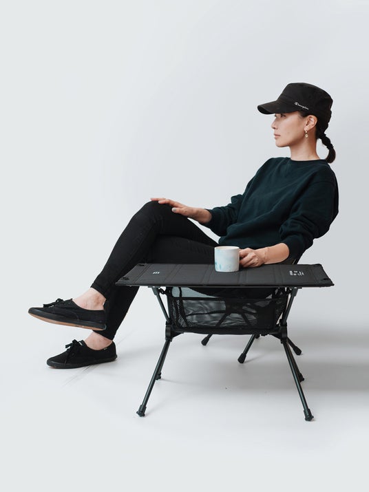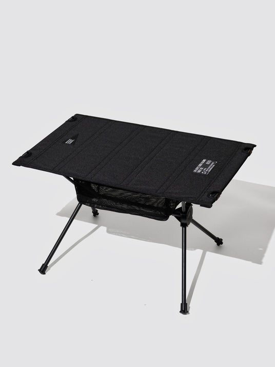長方形の折り畳み型テーブルです。従来モデルは布地だけの天板でしたが、こちらは布地にPP製のプレートを挟み込むことで抜群の安定感を実現。さらに洗った食器類を干したり小物の収納にも便利なメッシュバスケットを天板下に備えるなど、使いやすさが大幅にUPしています。