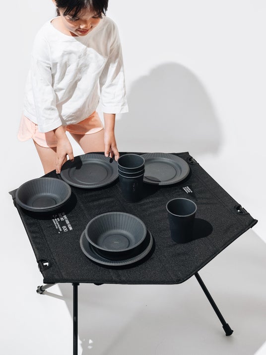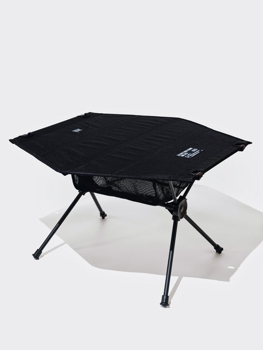 六角形折り畳み型テーブルです。3−4人で囲める大型の天板は布地にPP製のプレートを挟み込むことで抜群の安定感を実現。 さらに洗った食器類を干したり小物の収納にも便利なメッシュバスケットを天板下に備えるなど、使いやすさも抜群です。