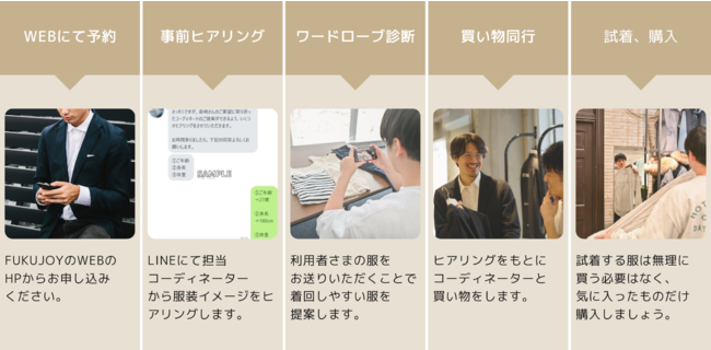 これまで多くの方にファッションコーディネートプランをご利用いただく中で、利用者から「デートや婚活で使える服をもっと知りたい」「スタイリストの方と買い物のみできるサービスが欲しい」といった声を多数受け、この度新たに、撮影を伴わず、恋活・婚活用の服をスタイリストと買い物できるコーディネートサービス「FUKUJOY」を提供開始することとなりました。
