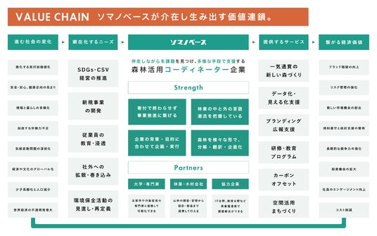 ソマノベースは、「人と人」「人と自然」「事業と自然」の関係を、森づくりでデザインする会社です。 土砂災害による人的被害をゼロにすることを目指し、山づくりや森林産業の再興に取り組んでいます。今後も企業や地域社会と連携し、持続可能な森林管理や環境保全活動を推進してまいります。