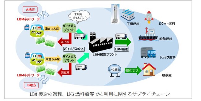本共同検討では、エア・ウォーターが環境省に採択され推進するLBMの技術開発・実証事業(註2)の下、北海道十勝地方で家畜糞尿から製造するLBMを、商船三井グループの内航LNG燃料船で2023年度前半に使用することを目指し、両社で船陸双方の既存設備で問題なく輸送・供給・使用できることを確認します。なお、LBMを舶用燃料として利用することは、国内初(註3)の取り組みとなります。