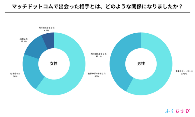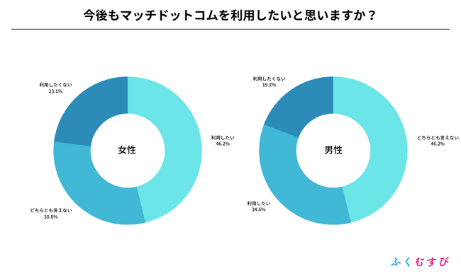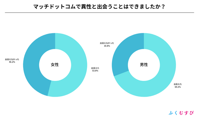 ・マッチドットコムで異性と出会えた割合は、男性が69.2%、女性が53.8%となりました。