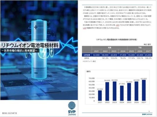 会員制マーケットリサーチサービスを提供している、株式会社SVPジャパン(本社:東京都中央区、代表取締役 社長:橋本雅、以下「SVPジャパン」)は、本日、SVP注目市場分析レポート「リチウムイオン電池電極材料-世界市場の現状と将来展望-」を、会員企業向けに公開いたしました。