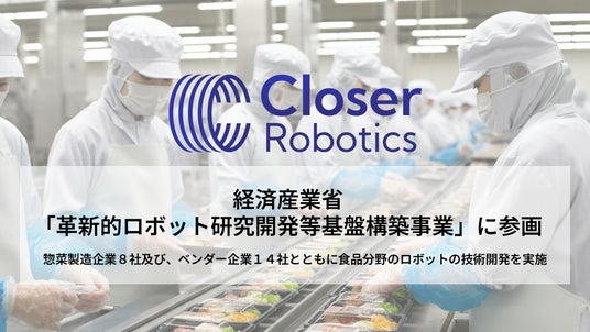 AIロボット開発の株式会社Closer(代表取締役:樋口翔太、本社:茨城県つくば市、以下「Closer Robotics」)は、経済産業省の「令和6年度革新的ロボット研究開発等基盤構築事業(食品分野)」にロボット研究開発企業として参画することが決定しました。