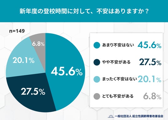 進級・進学による環境変化が大きい新年度。生活リズムの変動に不安を感じる保護者が多い中、一般社団法人 起立性調節障害改善協会は、小学校高学年~高校生の子どもを持つ保護者149名を対象に「新学期の登校時間と朝の起床に関する実態調査」を実施しました。その結果、約7割の子どもが「朝スムーズに起きられない」という課題を抱えており、保護者の約3人に1人が新年度の生活に対して不安を感じている実態が浮き彫りになりました。特に、朝のトラブルへの対策として「医療機関への相談」を検討する家庭はわずか2%に留まり、背景にある身体疾患「起立性調節障害(OD)」の可能性が見過ごされやすい現状が明らかになりました。