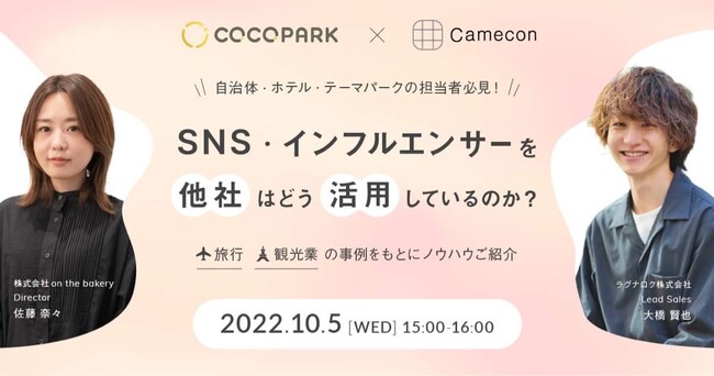 SNS運用・インフルエンサーPRのためのプラットフォーム「COCO PARK」を運営する株式会社on the bakery(本社:東京都港区 代表取締役:井戸 裕哉)は、2022年10月5日 (水)15:00より、『【自治体・ホテル・テーマパークの担当者必見!】SNS・インフルエンサーを他社はどう活用しているのか?~旅行・観光業の事例をもとにノウハウご紹介~』をオンラインにて開催いたします。