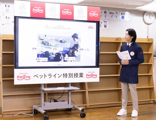 東京都渋谷区立中幡小学校の児童20名が集まる教室に、プロジェクトアンバサダーである寺田心さんとペットライン所属獣医師の宮平萌絵が登場しました。