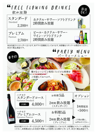 飲み放題【プレミアム】では、ハナモリのアルコールメニューがすべて飲み放題!!※ボトルワインは除く