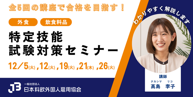 SG グループ株式会社(本社:東京都新宿区、代表:川上 真一郎)のグループ機関で、外食・宿泊・食品製造・介護事業者向けに特化した登録支援機関である一般社団法人 日本料飲外国人雇用協会(以下 当協会)は「2023年第3回 特定技能1号技能測定試験」の受験に向け、基礎知識から応用問題まで、過去問に基づいた試験対策を学ぶ全5回の講座『特定技能試験対策セミナー』の一般受付けを11月17日(金)より開始します。