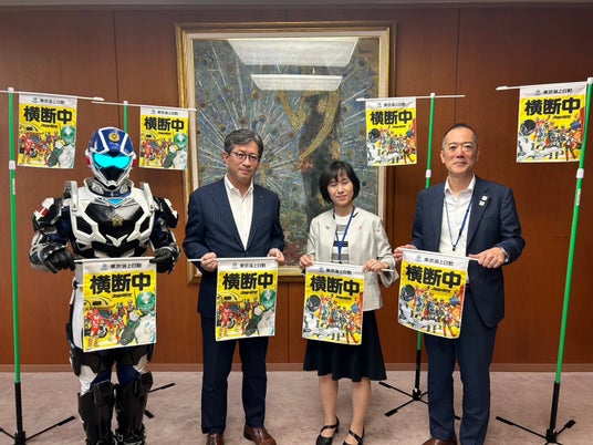 株式会社エムマーケットエージェンシーは、東京海上日動火災保険株式会社 福岡支店 (福岡市博多区 支店長:渡部一)が、昨年に続き今年も「ドゲンジャーズ」とタイアップした通学路の安全確保と、子供たちを交通事故から守る為の横断旗5000本を「交通事故をなくす福岡県県民運動本部」に寄贈したことを発表した。