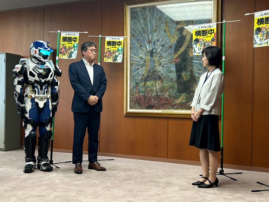 今年の寄贈式にも、「シン・ドゲンジャーズ」の出演ヒーロー「特務警察ヒャクトーバン」が登場し、子供たちの交通安全を守る為の活動に一役を担った。