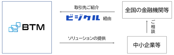 株式会社BTM(本社:東京都渋谷区、代表取締役社長兼CEO:田口 雅教、以下 BTM)は、地方企業のDXに向けて、株式会社BusinessTech(本社:東京都千代田区、代表取締役CEO:三浦 一大、以下、「BusinessTech」)が運営する問題解決プラットフォーム「ビジクル」と連携することを決定いたしました。