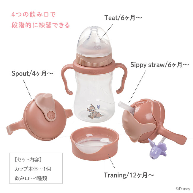 4種類の飲み口で段階的に赤ちゃんのドリンクトレーニングができる「Transition value pack ステップアップマグパック」に待望のDisneyシリーズが登場します!卒乳のタイミングの時期から使えるハンドル付きのティートとスパウト、そして離乳食が始まると必要になるストローマグ、最後にコップ飲みまでのドリンクトレーニングができるセットアイテムです。