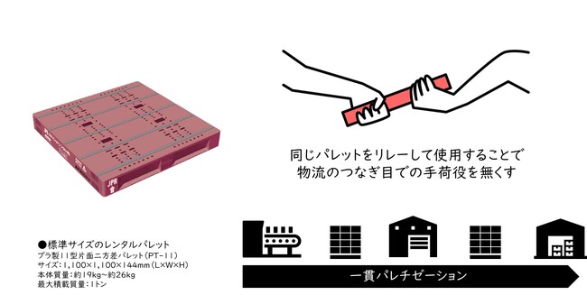 JPRは、1971年の創業来、標準パレットの共同利用の促進を通じて、物流のつなぎ目で起きやすい、ドライバーによる手荷役作業や長時間の待機を解消・緩和する取り組みを続けてきました。現在約1000万枚のパレットを保有する国内トップシェアのレンタルパレットサプライヤーとして、多様な地域、業種の企業をつないでいます。
