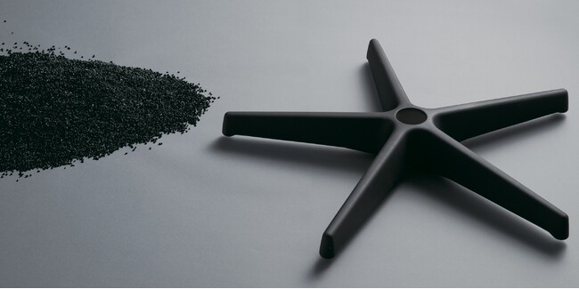 オカムラ独自のリサイクルインフラを確立し、使用済みのオカムラ製品を回収・分別して新たな製品の材料の一部として使用する「循環型の製品」の開発をする「Re:birth(リバース)」プロジェクトを開始。今回、オフィスチェアとして使用済みの樹脂脚を回収し、分別・粉砕を経て、再び新たな樹脂脚として生まれ変わったリサイクル脚を開発しました。